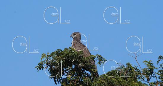 Aigle Martial, polemaetus bellicosus, Adulte perche en haut d'un Arbre, Parc du Masai Mara au Kenya